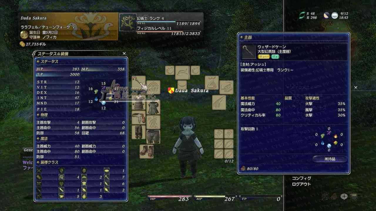 我们在主菜单中按HOME选择第一个,就会出现图1的装备及人物属性界面啦。在这个界面中,我们能看到自己现在的各个属性,还有副职业的等级,以及我们的装备,当鼠标移动到相应位置时,我们就可以看到该武器的属性和耐久度等。最终幻想14装备分的很细,除了主副武器之外,还有携带主副,携带主副,主要用于鱼饵等一系列辅助道具。