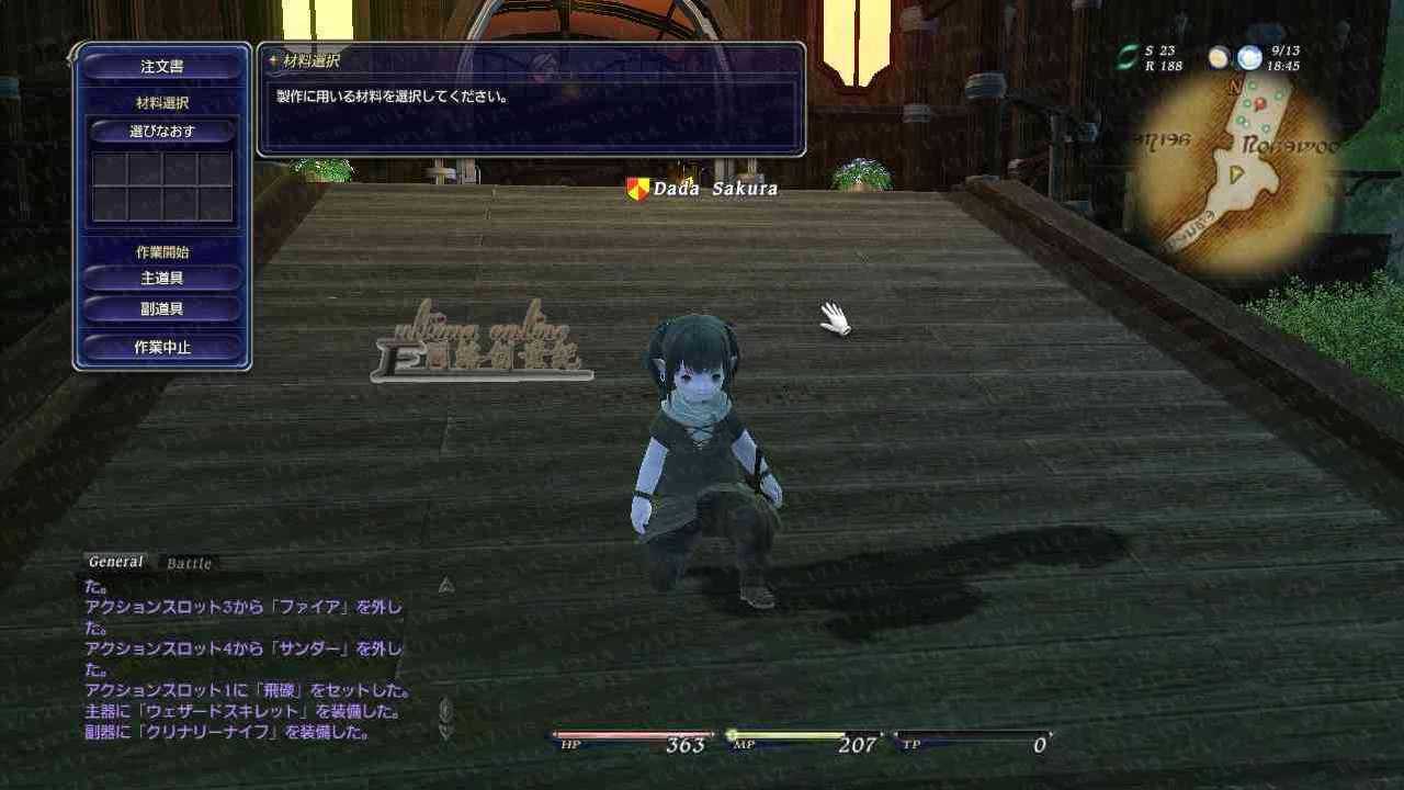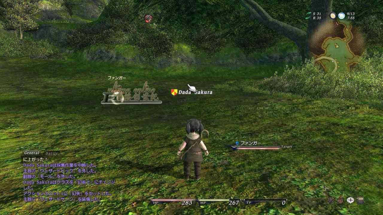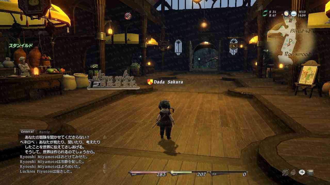 右上角蓝色圈圈部分为PING值,然后是时间,还有小地图,中下方是我们的HP和MP还有TP值啦。关于TP的介绍请等下看战斗系统介绍。然后再右下方有我们的一些基本的菜单,如表情和主菜单等,左下方就是聊天窗口啦。介绍完毕,我们去转转吧。