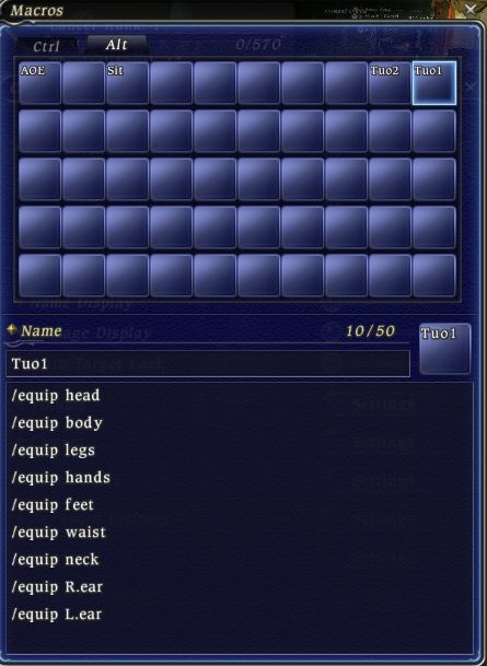 这个宏主要解决练商业技能脱穿衣服的麻烦做的。1。建宏2。复制命令到每行第一个宏(除戒指)/equiphead/equipbody/equiplegs/equiphands/equipfeet/equipwaist/equipneck/equipR.ear/equipL.ear第二