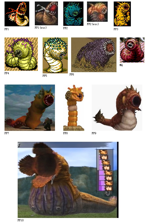 庞大而又愚笨的怪物,从FF1-10都有他的身影。HP多但是防御力极低,生活在沙漠中,怕水,擅长于搞沙暴,带暗黑属性。