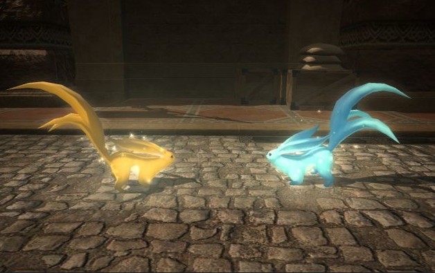 FF14: 宝石兽,召唤师召唤的随从,初级召唤兽,黄色为物理坦克性质,蓝色法系DPS性质,还是很可爱的生物。