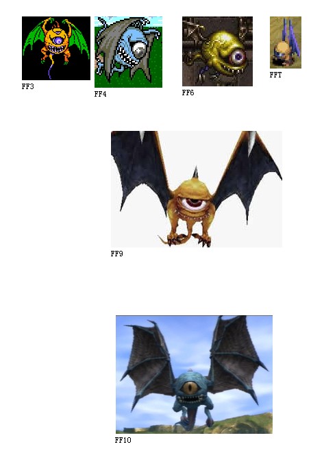 只有一只眼睛的蝙蝠是最终幻想系列里的传统飞行怪物,以从眼睛射出的激光为主要攻击方式,两翅可以发冲击波,攻击里面时常带有眩晕属性,具备强力魔法,往往包含即死魔法。阿里曼( アーリマン/ Ahriman)在袄教(Zoroastrimism,又为琐罗亚斯德教、拜火教)中称安格拉·曼纽(Angra Mainyu),恶界的最高神,代表着绝对的恶,纯粹的恶,是黑暗与死亡的大君。阿里曼与琐罗亚斯德奉为上帝的阿胡拉·玛兹达持续不断地进行斗争。