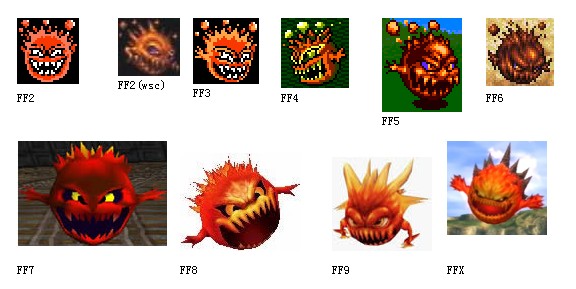 出现于游戏初期的低等火属性怪兽,以物理攻击和火魔法攻击为主,受物理攻击则膨胀升级,hp降到一定程度会以自我毁灭的方式打击敌人,青魔道师往往能从他们身上习得自爆特殊技。