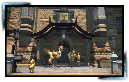 陆行鸟栏管理人戴着醒目的陆行鸟头面具,他们的鸟房遍布于艾欧泽亚各地的村落,为冒险者提供陆行鸟运输的服务。