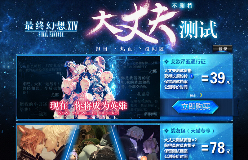 今日,官方宣布消息,将在7月8日下午1点开放第二批体验资格售卖。官方预售站出售10000份39元艾欧泽亚通行证,盛大游戏天猫旗舰店出售2000份78元战友包。
