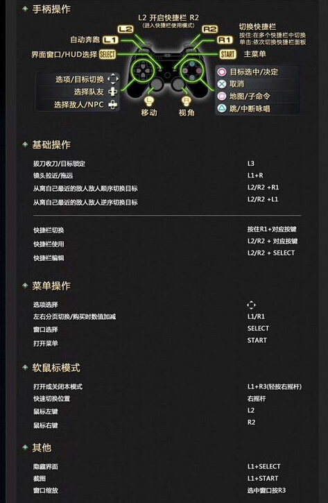 《最终幻想14》支持传统电脑外接手柄、XBOX键位手柄、PS键位手柄等多种手柄类型,并且玩家可以在游戏中自由设定键位,把自己习惯的操作模式对应设置到各个键位中,保证玩家最佳的游戏操作体验感。如镜头拉近、目标锁定、快捷栏切换等键位都可以通过手柄进行设置,把传统MMORPG中繁琐的操作化简,让你充分领略到《最终幻想14》角色扮演的那种代入感。(注:以下为PS3手柄操作简介,PC手柄可以对号入座,仅供参考。)