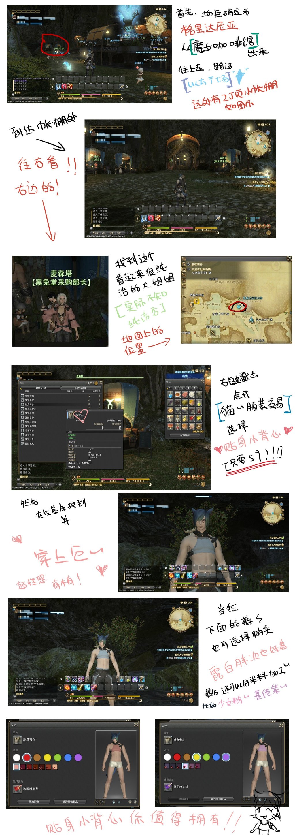 猫魅族的性感贴身小背心你值得有~~ 这种好东西 一定要让大家都穿起来。做了个小教程。字丑 =。= 配图应该看得懂。 (其他地图 有没有我没有去找过,其他种族什么样 我也没怎么看过,因为我只是个猫控)