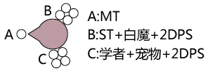 将除了MT以外的人和宠物平分为两拨,按图中B、C所示,固定站位,两边各站一个Healer。 吃到伤害的一边由本边Healer团队治疗,同时另一边的Healer要在此时主动看好MT的HP。 |