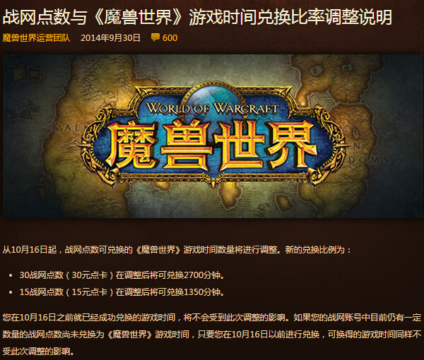 您在10月16日之前就已经成功兑换的游戏时间,将不会受到此次调整的影响。如果您的战网账号中目前仍有一定数量的战网点数尚未兑换为《魔兽世界》游戏时间,只要您在10月16日以前进行兑换,可换得的游戏时间同样不受此次调整的影响。