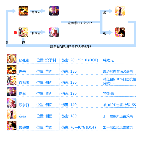 崩拳-正面宏,然后按上图循环。看目标身上的双龙脚DEBUFF选择正面宏还是侧面宏,因为双拳打的BUFF也是15S,省去自身BUFF的监视。三段技根据破碎拳的DEBUFF来决定破碎拳还是崩拳。