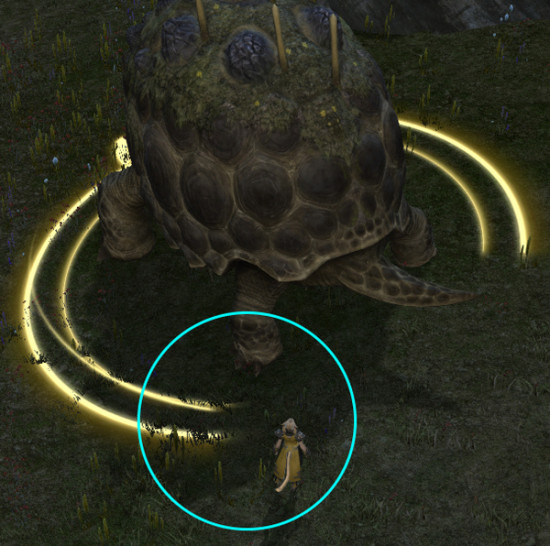 BOSS脚下有个黄圈,背后是一个缺口,站在缺口里面就算背面,站缺口外面就是侧面,所以我们站位可以站到图中所示的位置,斜对BOSS,找侧面背面只需要移动一小步即可。(无数次打水晶塔看到龙骑和武僧大幅度走来走去..。。)