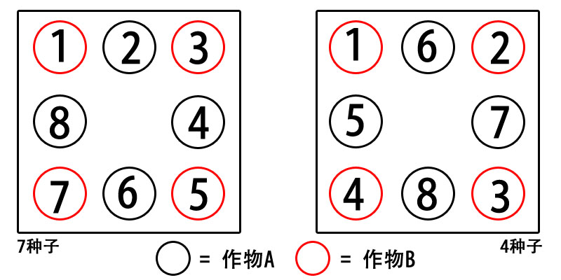 图中左侧的种植顺序可以在作物2、3、4、5、6、7、8上收获杂交种子,而右侧的种植顺序仅可以在5、6、7、8上收获杂交种子。