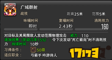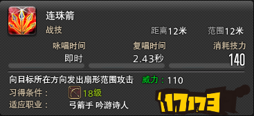 这三个技能为诗人的AOE技能,很多人认为就威力而言,这三个是一样的,但是广域群摄和死亡箭雨的TP消耗反而比这个多。在我看来,这两个技能是用来节省技力的,因为他有个15%的几率让下个技能0消耗,也就是说起手广域群射,在6下以内激活0消耗的特效之后就可以停手转用连珠箭输出,你都是赚的,第七下激活0消耗为不亏不赚,绝大多数情况3到5下能激活。如果第7下还没打出0消耗的话,只能自认脸黑=。=