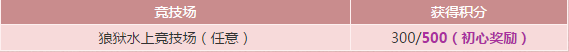 活动说明:在活动时间内,每次完成竞技场战斗,可获得300积分,若队伍中有人初次在狼狱水上竞技场中参战,则队伍全员可获得500积分。积分可重复累积获得,多劳多得哦~